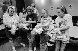 USA. ARIZONA. PHOENIX. Red cross babysitting classes. Red Cross workers run baby sitting classes in the Phoenix chapter. The students are aged from 11-15. They learn how to protect children from accidents and injury. They learn first aid for choking and bleeding, mouth to mouth and the Heimlich manoeuvre, and dealing with crying and changing diapers etc. At the end of the course they receive a certificate. Here we see learning the Haimlich manoeuvre. 1997.
