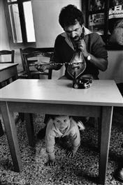 GREECE. Village of Olympos. The feast of Easter Day. Local postman and musician, Mihalis with his son, playing in a café. 1989.