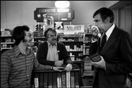 USA. Manchester, N H. Presidential primary campaign. Arizona Senator Morris UDALL Democratic candidate in the presidential primary elections, in a drugstore. He blows his nose, much to the appreciation of the locals. 1976