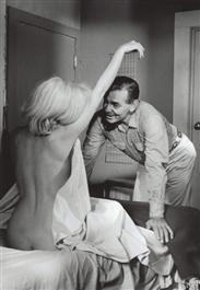 USA. Reno, Nevada. 1960. Set of "The Misfits". Clark Gable and Marilyn Monroe. The two are now lovers and Gay, who has been up early, comes to wake her and surprise her with breakfast. Roslyn sits up in bed slowly, delightedly. Movie camera cuts shot of Roslyn’s back a little under her shoulders.