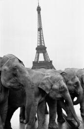 FRANCE. Paris. 16th arrondissement. Place du Trocadéro. Elephants of the Bouglione Circus during the "Cavalcade des cirques", cavalcade of circus passing through the town. In the background : the Eiffel Tower.