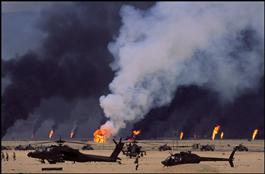 KUWAIT. US soldiers and helicopters in front of burning oil fields....