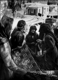 The market at the county fair. Hand-woven blankets are sold after long discussions. They have very unusual patterns and are very colorful.