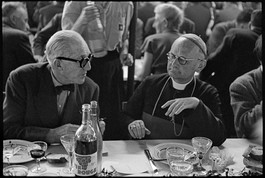 Simple meal in a make-shift wooden construction, which provided shelter for the celebrations. Le Corbusier is sitting next to the Bishop of Besançon.