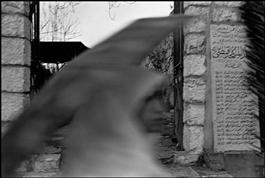 ISRAEL. Occupied East Jerusalem. January 2000. Muslim woman with umbrella walking past Muslim cemetery entrance on Id-al-Fitr, the day following the month long fast of Ramadan. On this day, Muslim cemetery on the western perimeter of the wall of the Old City as the sun ascends, to place palm leaves and pray at the graves of deceased family members.