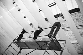 FRANCE. Paris. Three men installing a false ceiling in a building....