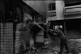 BOSNIA. Llidja. 1996. A civilian trying to put out a fire. Bosnian...