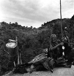 Rwabwera, an old Nahundi hunter with skins of the yellow-backed duiker, a very rare antelope. 1948.