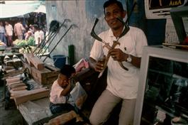 Asia. Indonesia. Sumatra. Aceh Province. Banda Aceh. Market salesman holds knives, made to sell to