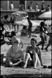 MOROCCO. Jdida. 1991. On the beach, a woman wears the traditional nigab, made of a burnous and a face veil, next to another in swimming trunks.