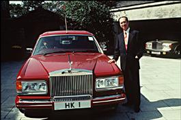 HONG KONG. 1992. Mr Stanley HO, a billionaire businessman who owns the Casinos in Macao and is an important entrepreneur with China. He has on his latest Rolls Royce the first numberplate of the City, it is not only considered a "lucky charm" but also an exterior sign of wealth. Mr HO is standing in front of his home.