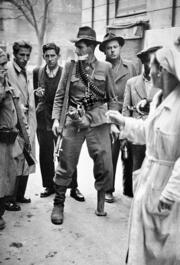 HUNGARY. BUDAPEST. Hungarian Revolution. A freedom fighter in Budapest, during a lull in the fighting, talks to other freedom fighters and seems oblivious of the problems that having a wooden leg must cause in such a situation. 1956.