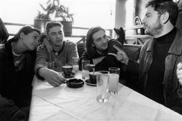 MACEDONIA. Tetavo. The Kohe Ditore Editor in chief 'Baton' Haxhui with his staff in his temporary office, the Cafe Arbi. Many of the Albanian Kosovans meet up in the cafe - the centre of town has become a meeting place for Pristina's exiled intellectuals. 1999