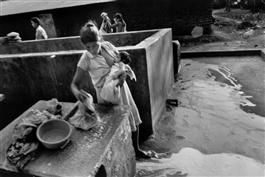 Santa Marta, Cabanas. 1991. Mother washing at community "pila" with newborn baby. Santa Marta was the first village of repatriated refugees established in a conflictive zone in 1986. In the early years of the war, campesinos (rural peasant farmers) were massacred by the U.S.-trained and supplied Salvadorean army. They fled into Honduras where they lived in refugee camps. Some lived in camps inside San Salvador. Eventually, during the war, human rights and church organizations encouraged them and assisted them in returning to their places of origin. Returned refugees were heavily supportive of the FMLN guerillas throughout the war. The peace accords were signed in January 1992 ending 12 years of civil war. Poverty remained the cause and the visible symptom of the long war. (El Salvador, page 38) ©Larry Towell/Magnum Photos