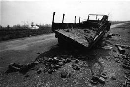 Kontum. Burnt out truck was hit by Vietcong artillery.