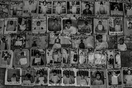 Karachi. At the home for Orphaned children in the Edhi village a pinboard displays photographs and names of some of them. When new children are brought to the home advertisements are placed on the papers and on TV in order to try and trace relatives. 1997.