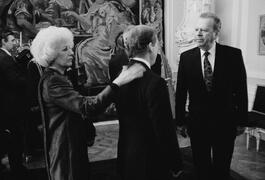 President Havel arrives at the Palace. His wife Olga brushes dust from his suit.