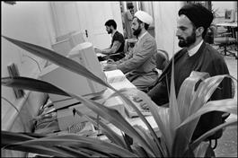 IRAN. Qum. 1997. Mullahs in traditional robes handle computers...