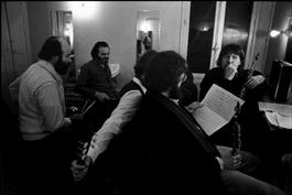 FRANCE. Ile-de-France region. Paris. 9th arrondissement. Olympia, 28 Boulevard des Capucines. From left to right : French jazz musician Henri TEXIER (double bass), Italian jazz musician Aldo ROMANO (drums), French jazz musicians Claude BARTHELEMY (guitar, guitar bass), François JEANNEAU (saxophones, clarinets) and Michel PORTAL (clarinets, saxophones, bandoneon). Work session backstage, in the dressing room, after rehearsal and soundcheck and before the evening concert. MICHEL PORTAL UNIT. Sunday, February 4th 1979.