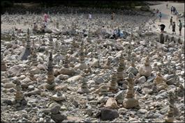 KOREA. Baekdamsa Buddhist Temple of the Jogye Order. Pilgrims and visitors make shamanic looking stupas from stones picked on the dry river bed.
