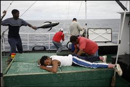 SPAIN. Galicia. Bonito tuna fishing on the Pachilan. 2008. A tuna that has just been reeled in is killed by banging its head on the wooden deck. It will be placed in a temporary hold. In the meanwhile, a fisherman takes a nap.
