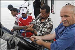 SPAIN. Galicia. Bonito tuna fishing on the Pachilan. 2008. Preparing to go to sea. The boat is fitted with two sidebeams, each holding five fishing lines. Five additional lines are attached to the stern. Here the sailors secure one of the beams.
