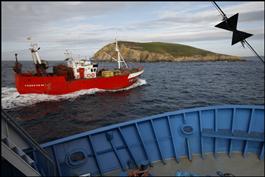 SPAIN. Galicia. Coastal fishing on board the Pino Ladra. 2008. Returning to port. The black double triangles signify that the ship is a trawler.