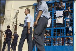 Greece. 3rd of September 2009. Island of Lesvos, also known as Mytilini, next to the Turkish border. The overcrowed detention center of Pagani for illegal immigrants including women and children. They were protesting against detention and some minors were on hunger strike. Activists from the international radical movement "No borders" gathered this year in Lesvos to support the migrants' fight.