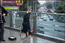 CHINA. Sichuan Province. Chengdu. Modern shopping center. An acrobat begs for cash.