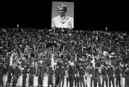 ZAIRE. Kinshasa. World Heavyweight Boxing Championship. At the stadium spectators stand underneath a portrait of Zaire's President MOBUTU. 1974.