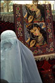 AFGHANISTAN. Kabul. A woman dressed in burquah passes by a hand-woven carpet showing the portrait of a sexy female dancer.