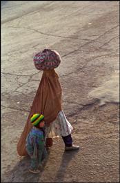 AFGHANISTAN. Kabul. December 2001. A burka clad woman and her child.