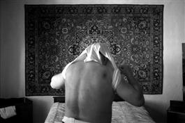 RUSSIA. Stari Atagi, Chechnya. 20/02/2002. Chechen man, 52 years old, showing his torture marks. He was just released from custody with the Russian Forces. During a 10-day "Zatshiska", cleaning-up or mobbing-up operation the village Stari Atagi was sealed entirely and house to house searched conducted by different groups of the Russian forces. Interior Ministry, Army, FSB. The man was arrested, beaten unconscious and mock executed several times, apparently because he bears a name similar to a "Wahabbi Rebell". After 5 days held in a ditch he was released, his passport confiscated. All in all about 26 men had a similar faith, 4 villagers where killed in a shootout, apparently rebells, and 2 FSB soldiers where ambushed.
