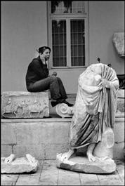 TURKEY. Mersin. 2005. In the courtyard of the anthropological museum, a woman uses a cellphone next to a Roman statue.