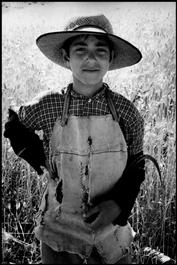 ITALY. Sicily. A farmer's son cutting wheat in his father's field, near Calarelli, in the traditionnal dress and manner. 1974.