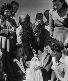 The new settlement of Alma in Northern Galilee. This town was built by Jews from Tripoli and one-time Italian Christians from San Nicandra who converted to Judaism. 80 new Jews who journeyed from Ita ly, are living together with Tripolitanian Jewish settlers.The land is arid and stony and most of the settlers work consists of clearing the fields of stones and constructing pipelines for irrigation. It is located near the Syrian border.