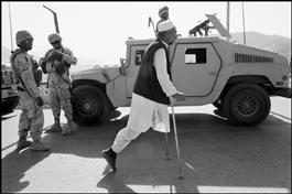 AFGHANISTAN. Kabul. A man amputated from a leg, presumably by a anti-personal landmine, walks past American GI's on patrol in the Humvee armoured vehicle.