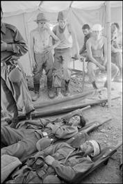 AFGHANISTAN. Panjshir Valley. Dashtak Village. Soviet soldiers watch Afghan counterparts wounded in battle on the location of "L'Etoile du Soldat" directed by Christophe de PONFILLY. The set represents a Soviet army base in the 80's. 2005.