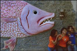 INDONESIA. Jepara. Giant fish mural, laughing girls.