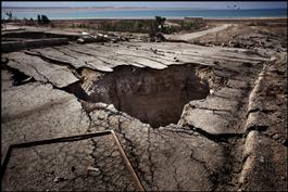 The former Numeira Salt Industries and neighboring fields, now abbandoned because of the phenomenon of the sink holes which have made the area unsafe. All this area was covered by the waters of the Dead Sea until a few years ago. Haditha, Jordan May 2009