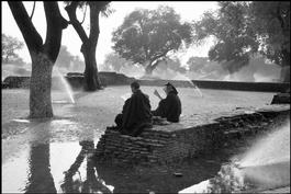 INDIA. 1. Uttar Pradesh. Sarnath, where the Buddha is believed to have reached enlightment. Two Tibetan Buddhist nuns read sacred texts among the ruins whose gardens are being watered.