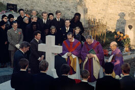 FRANCE. Champagne-Ardennes region. Colombey-les-deux-Eglises. General Charles DE GAULLE's funeral. In the cemetery, in front of the General's tomb. Among the personalities, the Minister of Culture André Malraux and the writer Romain Gary. Thursday 12 November 1970.