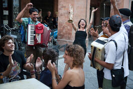 ITALY. Parma. 2011. A Sicilian trumpetist on vacation with friends joins in with a band of Roumanians at a bar.