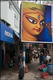 INDIA. 3. West Bengal. Kolkata. Advertising billboard uses the image of DURGA, the Bengali avatar of goddess KALI.