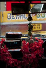 INDIA. 3. West Bengal. Kolkata. DURGA, the Bengali avatar of goddess KALI, adorned with flowers on a taxi dashboard.
