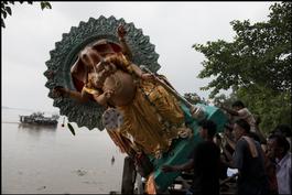 INDIA. 3. West Bengal. Kolkata. A giant statue of god GANESH is thrown in the HOOGLY river (local name of the GANGES).