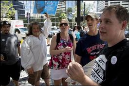 USA. Tampa, Florida. Republican National Convention. 2012. Lykes Gaslight Park, authorized for demonstrations. Ron Paul supporters gather for a protest and silent prayer.
