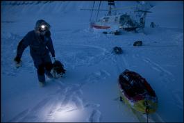 THE ARCTIC. Preparation for a departure of a few hours towards remote zones. Eric is going to analyze several parameters there. The young female dog Ounouak will accompany him. She is capable of spotting at a distance the presence of a possible polar bear in search of preys.