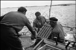 FRANCE. Brittany. North Finistere. Molene Island. The fishing port. Fishermen carrying crates of lobsters, crabs and prawns.Friday, 18 May 1973