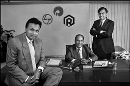INDIA. Mumbai. 1986. Brothers Anil and Mukesh with their father, Dhirubhai Ambani, Founder, Reliance Industries.
